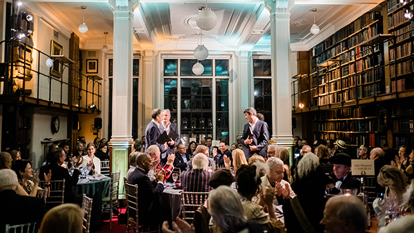 Over dinner in the Reading Room the Cantabile vocal quartet performed a range of literary-themed songs, including the humorous tribute to The London Library, personally written by Sir Tim Rice. Guests were also treated to readings by actor and comedian John Sessions and by cast members of the Victoria series – Jordan Waller and Anna Wilson-Jones.